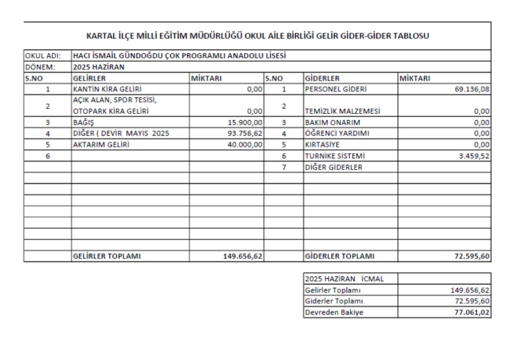 Haziran Ayı Gelir-Gider Bilançosu